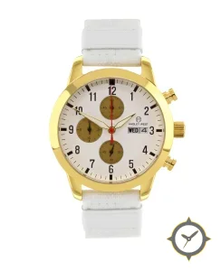 A Chronograph watch with a versatile 39.5mm case, that suits most wrists, crafted from gold featuring a white dial with a unique smooth finish.
