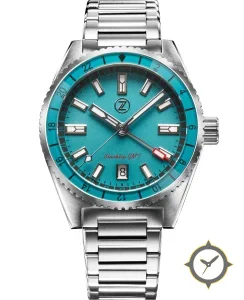 A GMT watch with a vintage-inspired 33mm case, crafted from stainless steel featuring a turquoise dial with a unique matte/grained finish and a true GMT complication for tracking a second time zone.