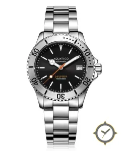 A Dive watch with a vintage-inspired 35.5mm case, crafted from stainless steel featuring a black dial with a unique radial sunburst finish.
