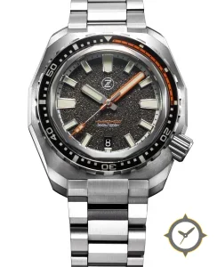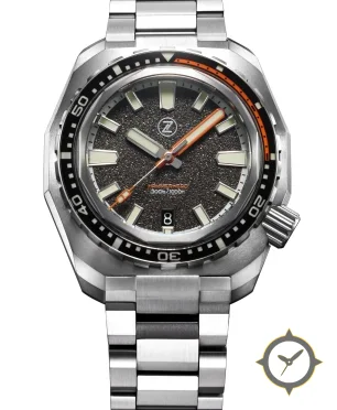 A Dive watch with a bold 42mm presence on the wrist, crafted from stainless steel featuring a black dial with a unique granular/sandpaper texture finish.