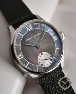A Dress watch with a vintage-inspired 34mm case, crafted from stainless steel featuring a black dial with a unique mother-of-pearl iridescent (nacre) finish.