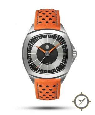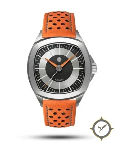 A Racing watch with a vintage-inspired 35.5mm case, crafted from stainless steel featuring a black dial with a unique brushed concentric rings finish.