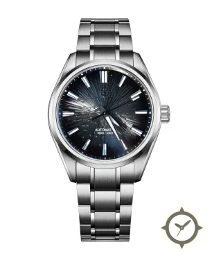 A Sports watch with a bold 45.5mm presence on the wrist, crafted from stainless steel featuring a black dial with a unique sunburst / radial engraved texture finish.