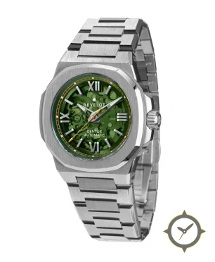 A Luxury watch with a vintage-inspired 32.5mm case, crafted from stainless steel featuring a green dial with a unique open-worked (skeleton) with visible movement finish.