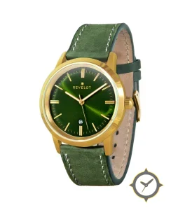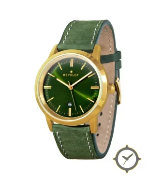 A Dress watch with a vintage-inspired 28.5mm case, crafted from gold featuring a green dial with a unique sunburst finish.