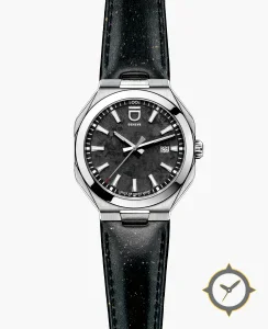 A Luxury watch with a versatile 41mm case, that suits most wrists, crafted from stainless steel featuring a gray dial with a unique marbled / meteorite-like stone texture finish.