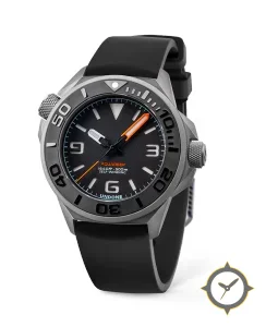 A Dive watch with a bold 49.5mm presence on the wrist, crafted from titanium featuring a black dial with a unique grained/matte finish.