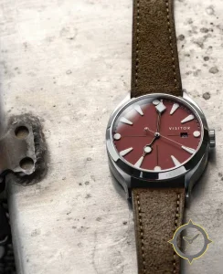 A Field watch with a vintage-inspired 35mm case, crafted from stainless steel featuring a red dial with a unique matte finish.