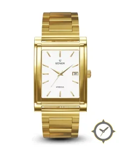 A Dress watch with a vintage-inspired 31.5mm case, crafted from gold featuring a white dial with a unique smooth finish.