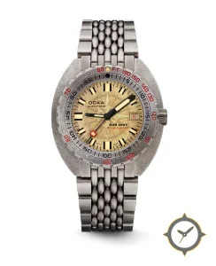 A Dive watch with a vintage-inspired 36mm case, crafted from stainless steel featuring a gold dial with a unique aged, distressed patina with radial graining finish.