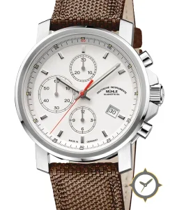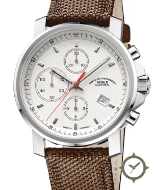 A Chronograph watch with a vintage-inspired 36mm case, crafted from stainless steel featuring a white dial with a unique matte lacquer finish.
