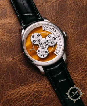 A Skeleton watch with a bold 42mm presence on the wrist, crafted from stainless steel featuring a gold dial with a unique marbled / sunburst (tiger-eye-like) finish.