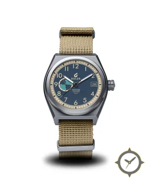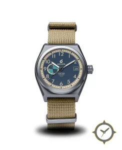 A Field watch with a vintage-inspired 34.5mm case, crafted from stainless steel featuring a navy dial with a unique matte finish.
