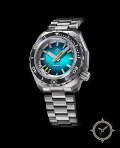 A Dive watch with a versatile 38mm case, that suits most wrists, crafted from stainless steel featuring a turquoise dial with a unique fumé / sunburst finish.