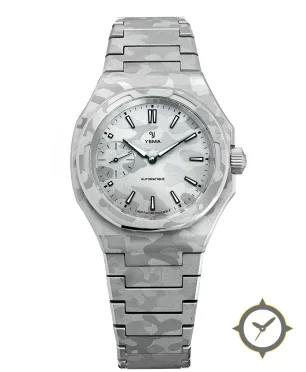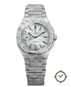 A Luxury watch with a vintage-inspired 32mm case, crafted from stainless steel featuring a silver dial with a unique brushed with camouflage motif finish.