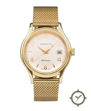 A Dress watch with a bold 42.5mm presence on the wrist, crafted from gold featuring a white dial with a unique brushed finish.