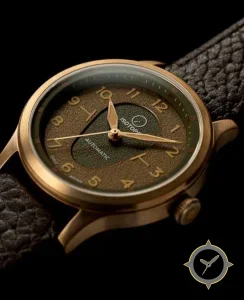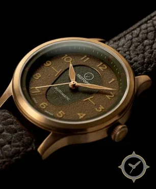 A Field watch with a bold 45.5mm presence on the wrist, crafted from bronze featuring a brown dial with a unique sandblasted/grainy texture finish.
