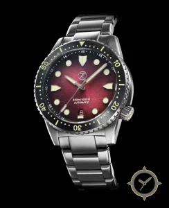 A Dive watch with a vintage-inspired 32.5mm case, crafted from stainless steel featuring a red dial with a unique sunburst / textured swirl finish.