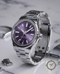 A Dive watch with a vintage-inspired 30.5mm case, crafted from stainless steel featuring a purple dial with a unique sunburst finish.