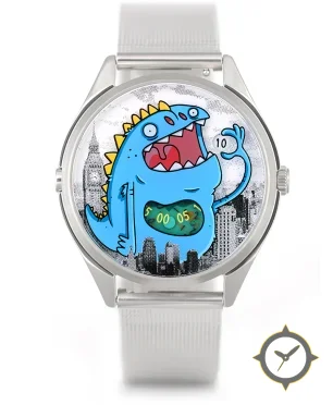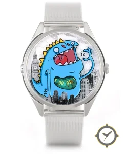 A Minimalist watch with a vintage-inspired 30.5mm case, crafted from stainless steel featuring a white dial with a unique printed illustration finish.