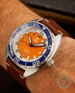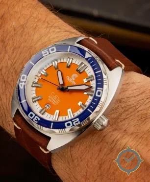 A Dive watch with a bold 46.5mm presence on the wrist, crafted from stainless steel featuring a orange dial with a unique matte finish.