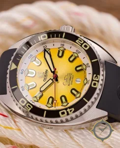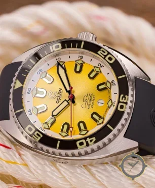 A Dive watch with a bold 43.5mm presence on the wrist, crafted from stainless steel featuring a yellow dial with a unique sunburst (metallic) finish.