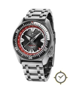 A GMT watch with a vintage-inspired 36mm case, crafted from stainless steel featuring a black dial with a unique textured, radiating wavy/guilloché pattern finish and a true GMT complication for tracking a second time zone.