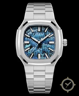 A Luxury watch with a vintage-inspired 31.5mm case, crafted from stainless steel featuring a blue dial with a unique graffiti-style painted texture with layered brushstrokes finish.