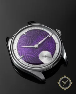 A Dress watch with a bold 45mm presence on the wrist, crafted from stainless steel featuring a purple dial with a unique guilloché finish.