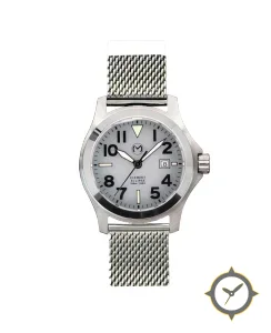 A Field watch with a vintage-inspired 33mm case, crafted from stainless steel featuring a gray dial with a unique matte sunburst finish.