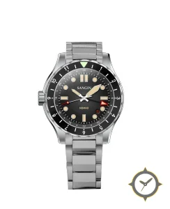 A Sports watch with a vintage-inspired 37mm case, crafted from stainless steel featuring a black dial with a unique sunburst finish.