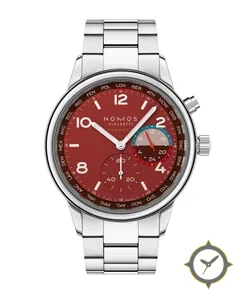 A World Timer watch with a versatile 40.5mm case, that suits most wrists, crafted from stainless steel featuring a crimson dial with a unique lacquer finish, perfect for the global traveler with its world-time function.