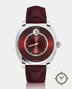 A Dress watch with a vintage-inspired 33mm case, crafted from stainless steel featuring a crimson dial with a unique sunburst concentric guilloché finish.