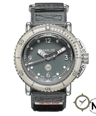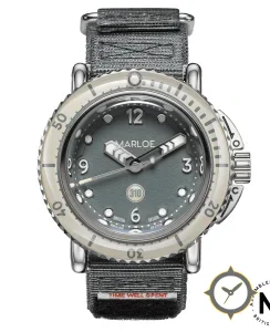 A Dive watch with a vintage-inspired 36.5mm case, crafted from stainless steel featuring a gray dial with a unique grained/textured finish.