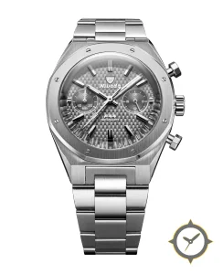 A Chronograph watch with a bold 44.5mm presence on the wrist, crafted from stainless steel featuring a gray dial with a unique carbon fiber / waffle (tapisserie) texture finish.