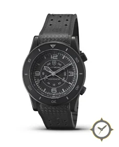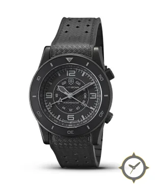 A Dive watch, crafted from stainless steel featuring a black dial with a unique wavy/raised wave pattern in center finish and a true GMT complication for tracking a second time zone.