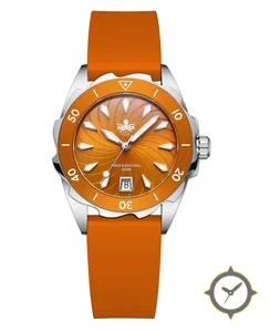 A Dive watch with a vintage-inspired 36mm case, crafted from stainless steel featuring a orange dial with a unique sunburst finish.