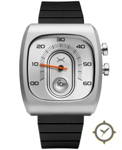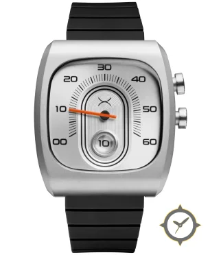 A Minimalist watch with a bold 45mm presence on the wrist, crafted from stainless steel featuring a silver dial with a unique brushed metallic finish.