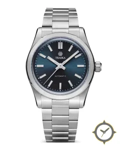 A Sports watch with a vintage-inspired 30mm case, crafted from stainless steel featuring a blue dial with a unique sunburst finish.