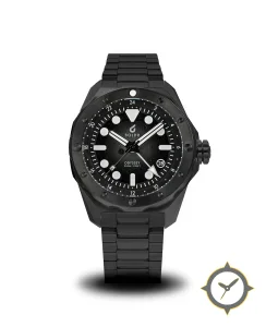 A Dive watch with a bold 45.5mm presence on the wrist, crafted from stainless steel featuring a black dial with a unique matte finish and a true GMT complication for tracking a second time zone.