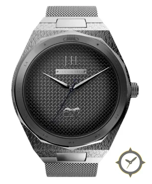 A Luxury watch with a bold 48.5mm presence on the wrist, crafted from stainless steel featuring a black dial with a unique crosshatch guilloché (waffle/crosshatch) finish.