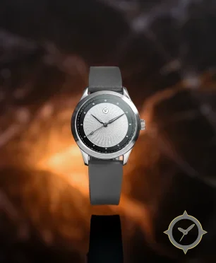 A Minimalist watch with a vintage-inspired 34mm case, crafted from stainless steel featuring a silver dial with a unique guilloche (wavy concentric pattern) finish.