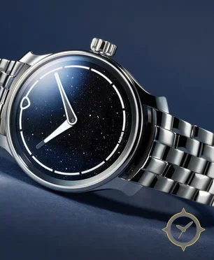 A Minimalist watch with a bold 43mm presence on the wrist, crafted from stainless steel featuring a navy dial with a unique aventurine (starry) finish finish.