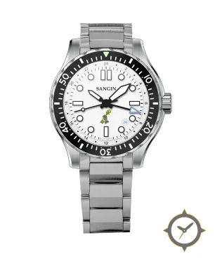 A Dive watch with a versatile 40.5mm case, that suits most wrists, crafted from stainless steel featuring a white dial with a unique matte finish and a true GMT complication for tracking a second time zone.
