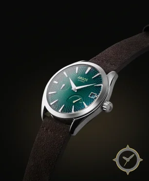 A Dress watch with a versatile 38.5mm case, that suits most wrists, crafted from stainless steel featuring a green dial with a unique radial guilloché (textured) finish and a helpful power reserve indicator.