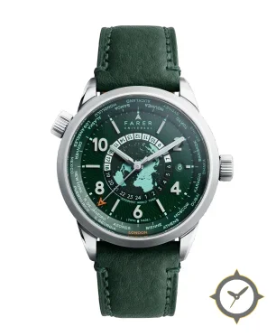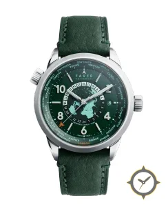 A World Timer watch with a versatile 41mm case, that suits most wrists, crafted from stainless steel featuring a green dial with a unique textured (guilloché/radiant grid) finish, perfect for the global traveler with its world-time function.