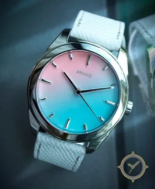 A Minimalist watch with a vintage-inspired 32.5mm case, crafted from stainless steel featuring a turquoise dial with a unique smooth ombré gradient (pink to turquoise) finish.