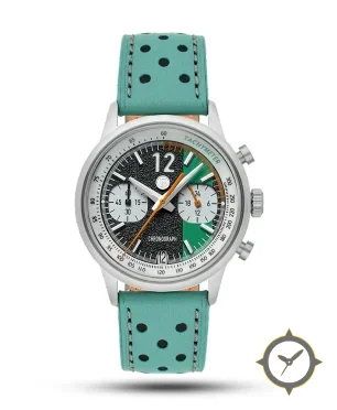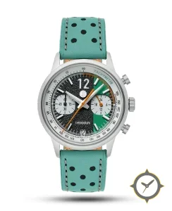 A Chronograph watch with a vintage-inspired 35mm case, crafted from stainless steel featuring a black dial with a unique textured/grain finish.