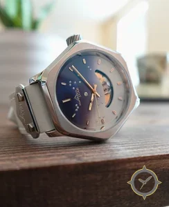 A Skeleton watch with a vintage-inspired 28.5mm case, crafted from stainless steel featuring a blue dial with a unique sunburst gradient finish.