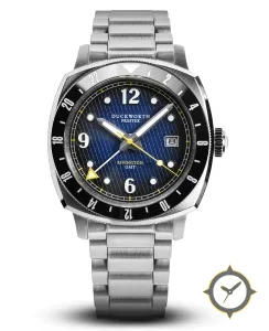 A GMT watch with a bold 47mm presence on the wrist, crafted from stainless steel featuring a blue dial with a unique vertical pinstripe / textured finish and a true GMT complication for tracking a second time zone.